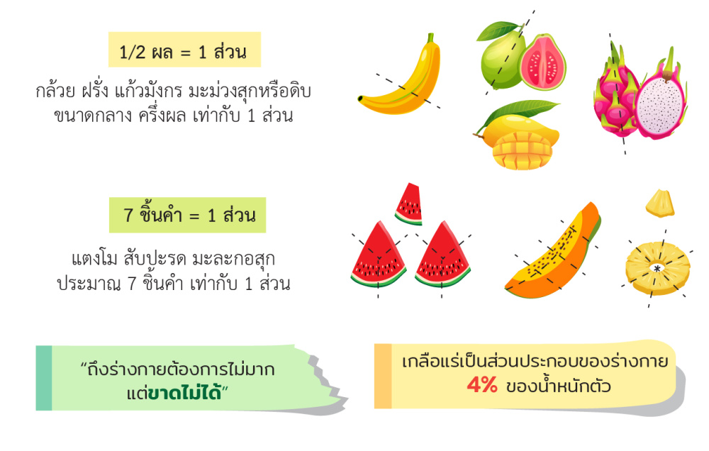 ในหนึ่งวัน ผู้ใหญ่ควรกินผักให้ได้ 4-6 ทัพพี ผลไม้ 3-5 ส่วน เช่น