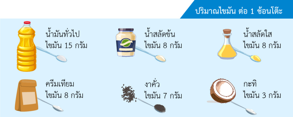 วันหนึ่งๆ เราควรได้พลังงานจากไขมัน ร้อยละ 30 ของพลังงานที่ควรได้รับต่อวัน เช่น ต้องการพลังงานจากอาหาร 2,000 กิโลแคลอรี่ ต้องมาจากไขมันประมาณ 600 กิโลแคลอรี่ หรือประมาณ 4.5 ช้อนโต๊ะ