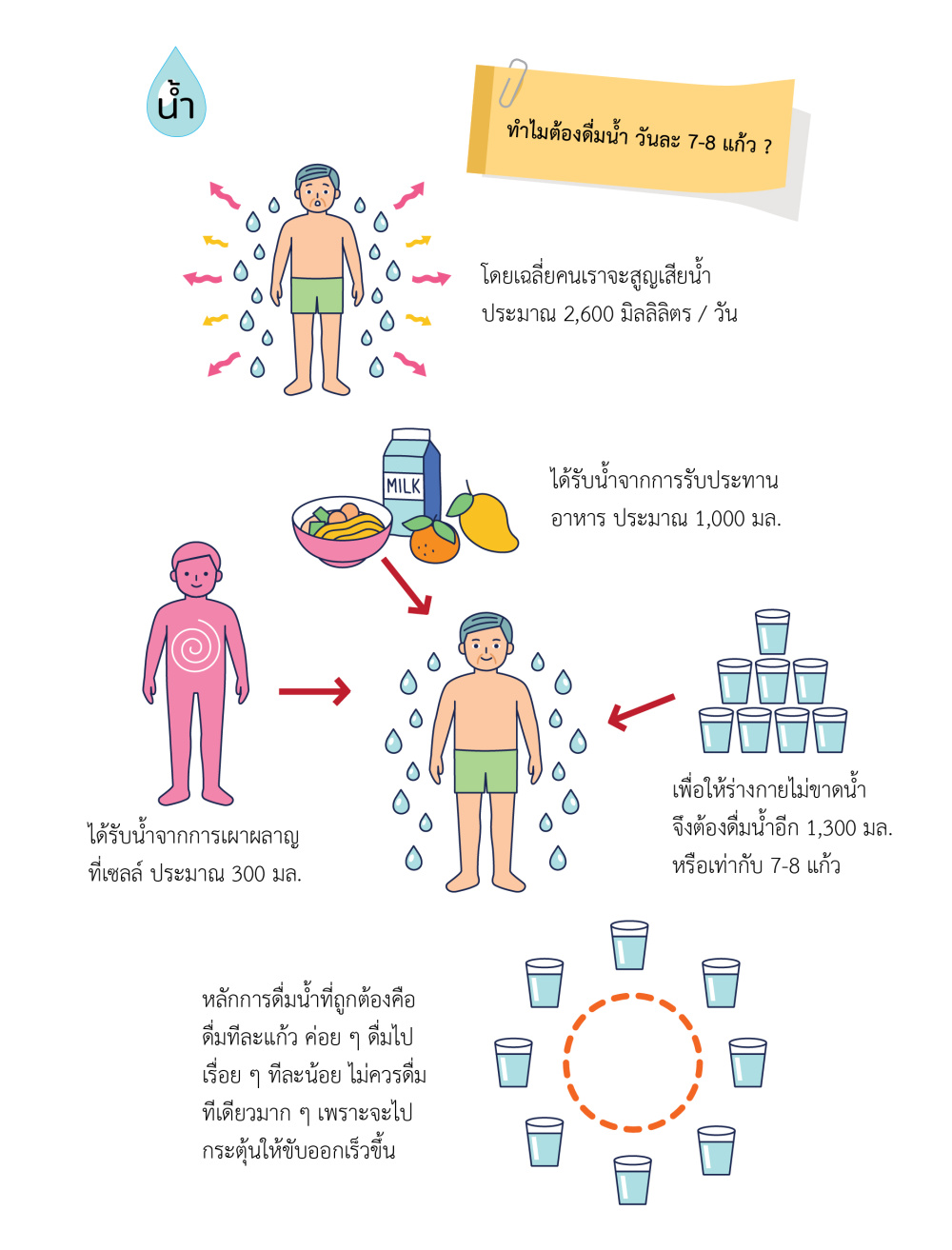 วัยผู้ใหญ่ควรดื่มน้ำ ให้ได้อย่างน้อยประมาณ 2,000 มล. ต่อวัน หรือ 8 แก้ว โดยดื่มแบบจิบทีละน้อยตลอดวัน แทนการดื่มคราวละมากๆ