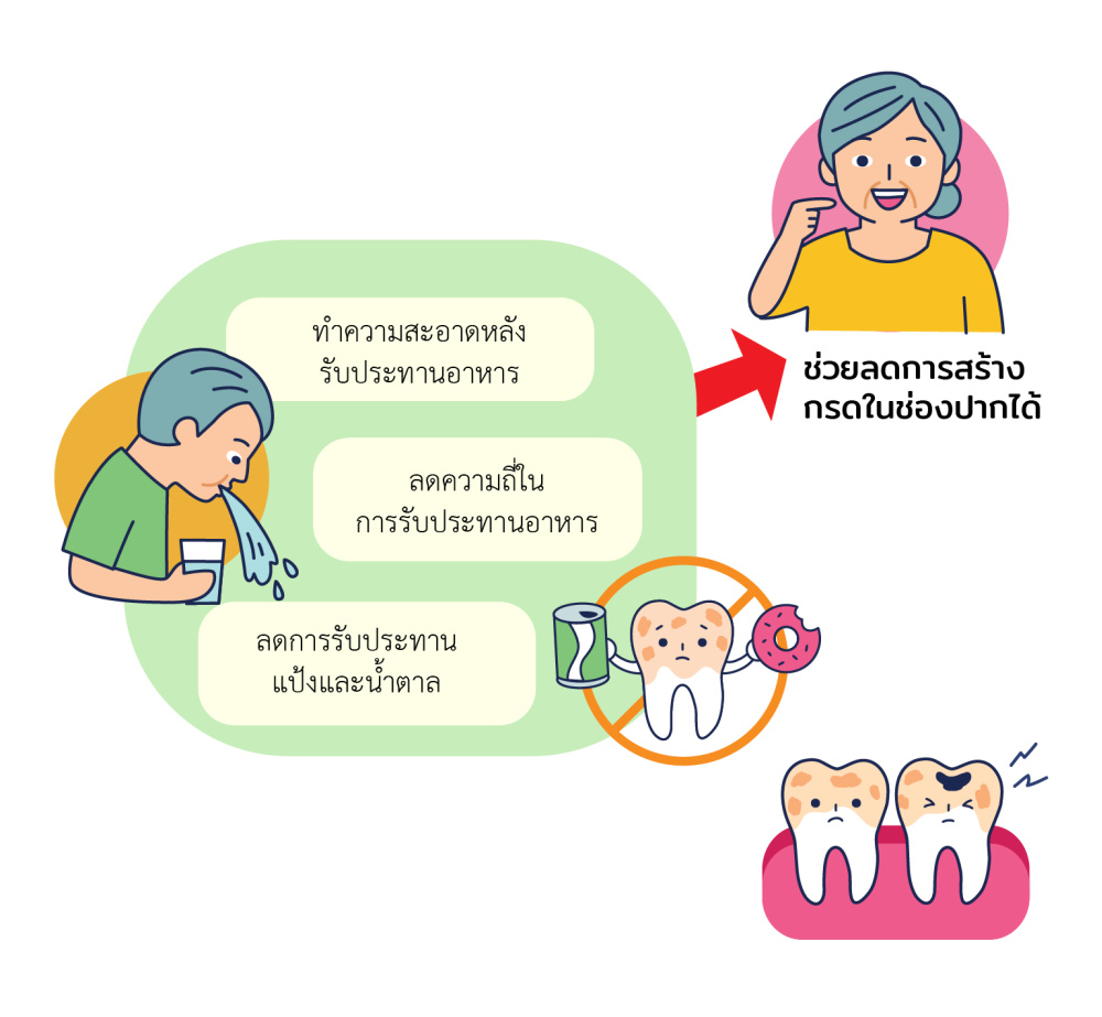 ดังนั้น ทำความสะอาดหลังรับประทานอาหาร การลดความถี่ในการรับประทานอาหาร หรือลดการรับประทานอาหารแป้งและน้ำตาล เป็นการลดการสร้างกรดในช่องปากได้ ในขณะเดียวกันน้ำลายในช่องปาก มีน้ำและแร่ธาตุต่างๆ ช่วยลดเป็นความกรด และสามารถมีการคืนกลับของแร่ธาตุจากน้ำลายเข้าสู่ผิวฟัน ทำให้ฟันไม่ผุได้