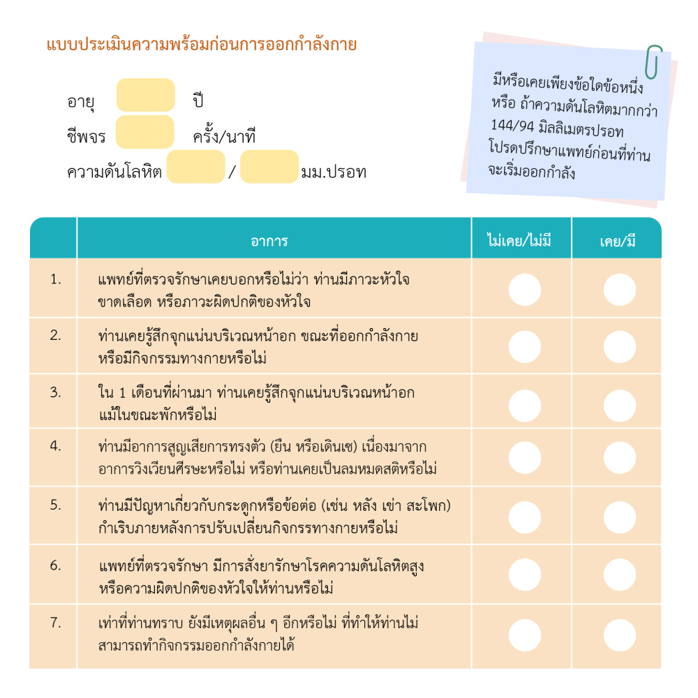 ก่อนเริ่มต้นโปรแกรมการออกกำลังกายควรประเมินความพร้อมของตัวเองก่อน ด้วยการใช้แบบประเมินความพร้อมก่อนการออกกำลังกาย หรือ Par Q หากมีคำถามที่ตรงกับความจริงของท่าน 1 ใน 7 ข้อ ตามแบบประเมิน ควรทำการปรึกษาแพทย์ หรือผู้เชี่ยวชาญด้านการออกกำลังกายว่าสามารถออกกำลังกายอะไรได้บ้าง