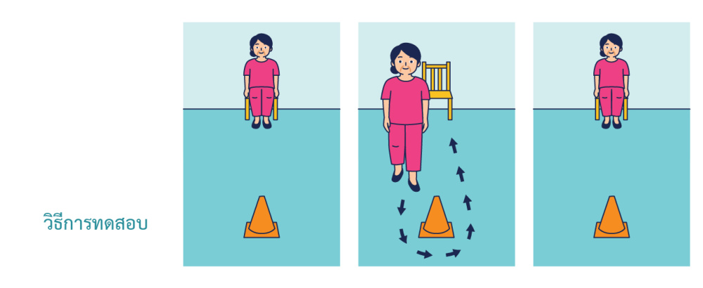 เกณฑ์การทดสอบ : ถ้าผู้สูงอายุใช้เวลามากกว่า 9 วินาที ถือว่าความคล่องแคล่ว หรือทรงตัวไม่ดี เป็นผู้ที่มีความเสี่ยงต่อการล้ม
