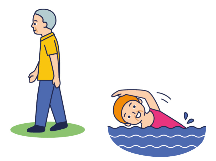 การเดิน เป็นการเคลื่อนไหวพื้นฐาน ซึ่งทำได้ง่ายและมีประโยชน์มากสำหรับผู้สูงอายุ ผู้สูงอายุจะได้รับประโยชน์อย่างมากในเรื่องของระบบหลอดเลือดและหัวใจ แต่ถ้ามีปัญหาเรื่องข้อเข่า หรือข้อเท้าอักเสบ หรือเสื่อมให้หลีกเลี่ยงไปเป็นการว่ายน้ำจะเหมาะสมกว่า
