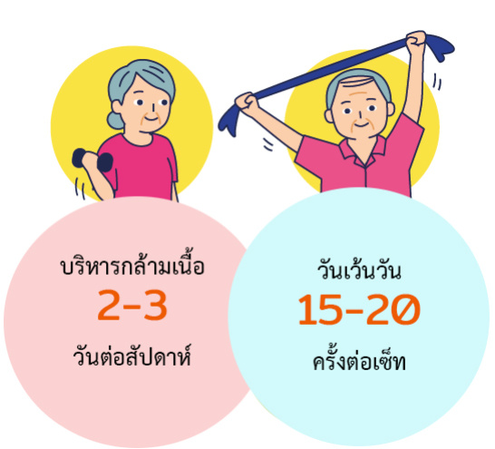 • บริหารกล้ามเนื้อ 2-3 วันต่อสัปดาห์• วันเว้นวัน 15-20 ครั้งต่อเซ็ท