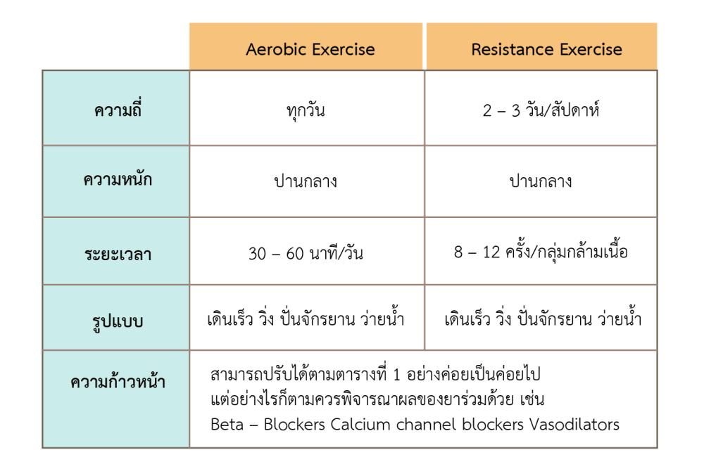 - Resistance exercise ความหนัก :ปานกลาง = น้ำหนักที่ยกได้ 8 – 12 ครั้ง/กลุ่มกล้ามเนื้อ