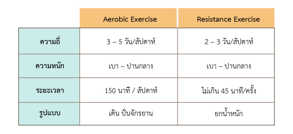 การควบคุมน้ำหนัก ควรออกกำลังกายให้ได้ 150 นาที/สัปดาห์ และมีการออกกำลังกายทุกวัน