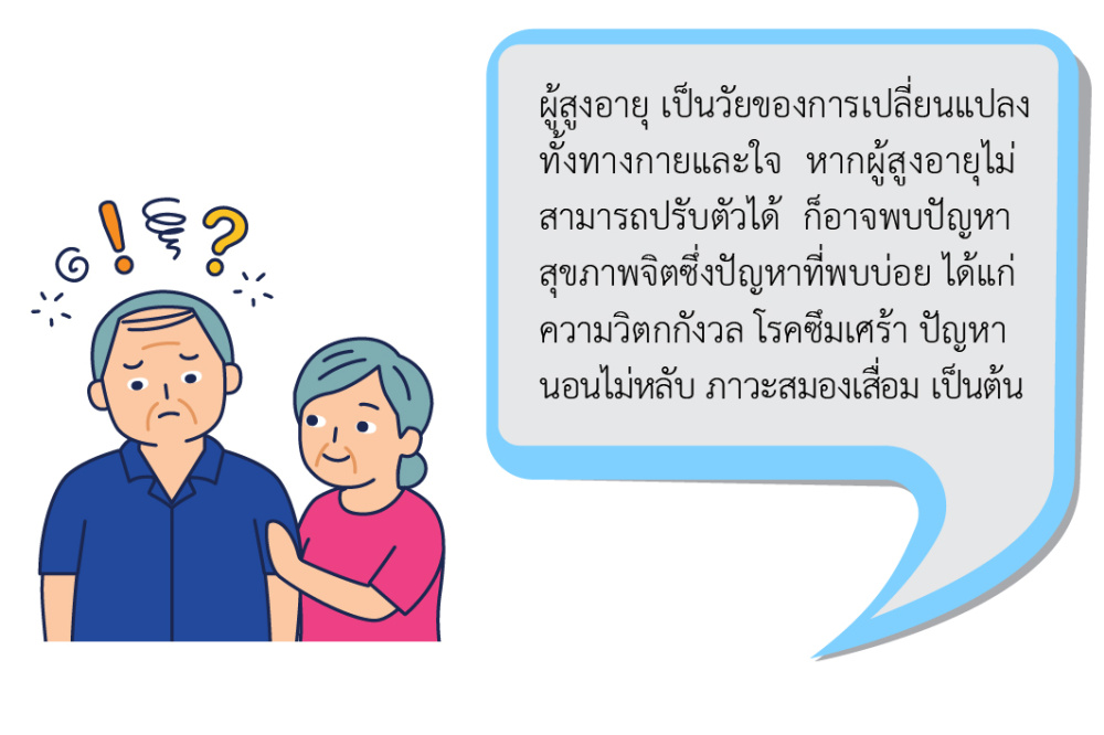 วัยสูงอายุ เป็นวัยของการเปลี่ยนแปลงทั้งทางกายและใจ หากผู้สูงอายุไม่สามารถปรับตัวได้ ก็อาจพบปัญหาสุขภาพจิต ซึ่งปัญหาที่พบบ่อย เช่น ความวิตกกังวล โรคซึมเศร้า ปัญหานอนไม่หลับ ภาวะสมองเสื่อม เป็นต้น