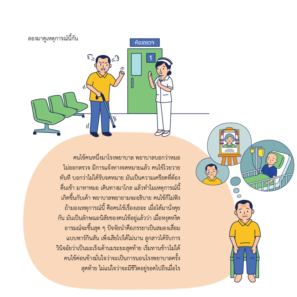 คนไข้คนหนึ่งมาโรงพยาบาล พยาบาลบอกว่าหมอไม่ออกตรวจมีการแจ้งทางจดหมายแล้ว คนไข้โวยวายทันทีบอกว่าไม่ได้รับจดหมาย มันเป็นความเครียดที่ต้องตื่นเช้ามาหาหมอเดินทางมาไกล แล้วทำไมเหตุการณ์นี้เกิดขึ้นกับเค้า พยาบาลพยายามจะอธิบายคนไข้ก็ไม่ฟัง ถ้ามองเหตุการณ์นี้ คือคนไข้เรื่องเยอะ เมื่อได้มานั่งคุยกัน มันเป็นลักษณะนิสัยของคนไข้อยู่แล้วว่า เมื่อหงุดหงิด อารมณ์จะขึ้นสุด ๆ ปัจจัยนำคือภรรยาเป็นสมองเสื่อม แบบพาร์กินสัน เพิ่งเสียไปได้ไม่นาน ลูกสาวได้รับการวินิจฉัยว่าเป็นมะเร็งเต้านมระยะสุดท้าย เริ่มทานข้าวไม่ได้ คนไข้ค่อนข้างมั่นใจว่าจะเป็นการนอนโรงพยาบาลครั้งสุดท้าย ไม่แน่ใจว่าจะมีชีวิตอยู่รอดไปถึงเมื่อไร
