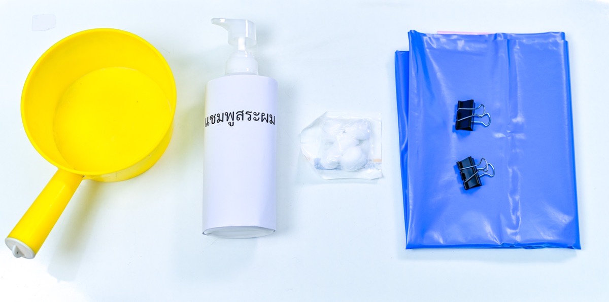 1. จัดเตรียมอุปกรณ์ทั้งหมดให้พร้อม วางในบริเวณที่สามารถหยิบใช้ได้สะดวก2. จัดท่าทางในการสระผม ในกรณีที่เตียงนอนไม่สามารถถอดส่วนหัวเตียงออกได้ ให้นำหมอนออก และเลื่อนศีรษะของผู้ป่วยมาไว้ที่ขอบเตียงด้านข้าง