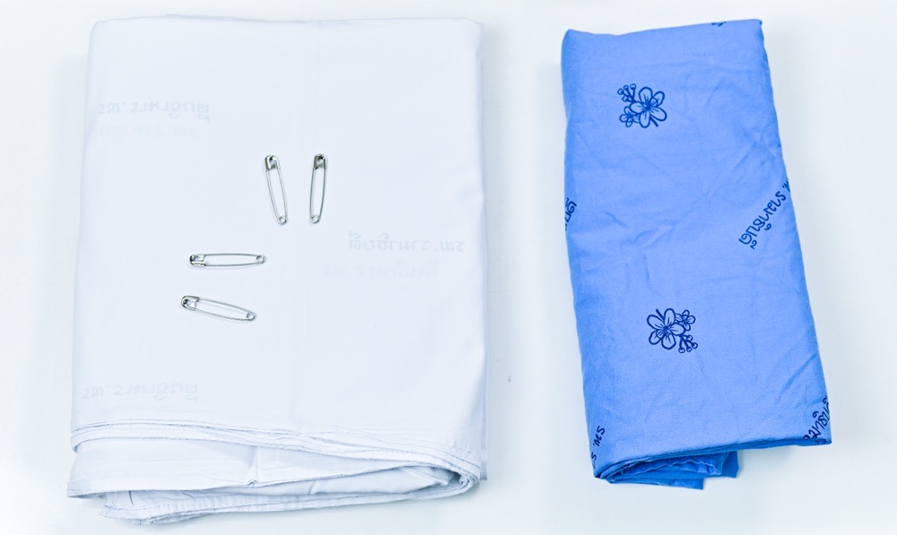 6. ปูผ้าปูเตียงผืนใหม่ ให้กึ่งกลางของผ้าอยู่กึ่งกลางเตียง เหน็บผ้าด้านหัวและท้ายเตียงพร้อมม้วนผ้าปูเตียงผืนใหม่ให้ชิดกับผ้าปูที่นอนผืนเก่า