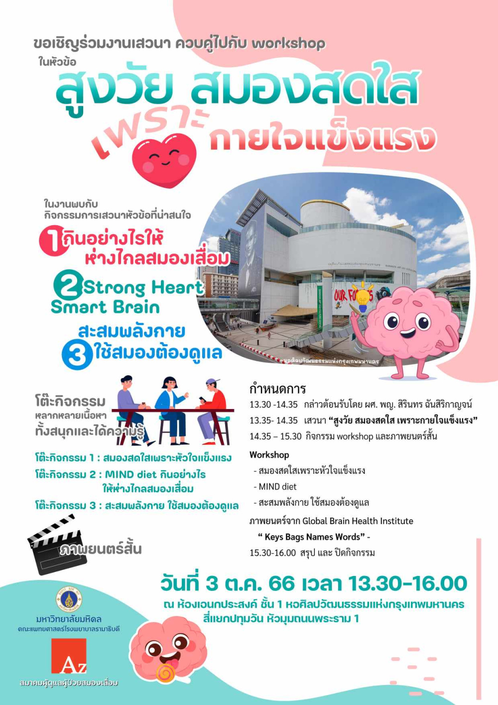 อังคารที่ 3 ตุลาคม 66 เวลา 13.30-16.00 น. ใครว่างแวะมางานเสวนา&workshop หัวข้อ "สูงวัย สมองสดใส เพราะกายใจแข็งแรง" แฟนๆ อาจารย์อ้อย ผศ.พญ.สิรินทร ฉันสิริกาญจน มาพบกันได้ในงานค่า รอบนี้จัดในสถานที่อาร์ตๆนะคะ ห้องเอนกประสงค์ ชั้น 1 หอศิลปวัฒนธรรมแห่งกรุงเทพมหานคร BACC สี่แยกปทุมวัน หัวมุมถนนพระราม 1 แล้วพบกันค่ะ