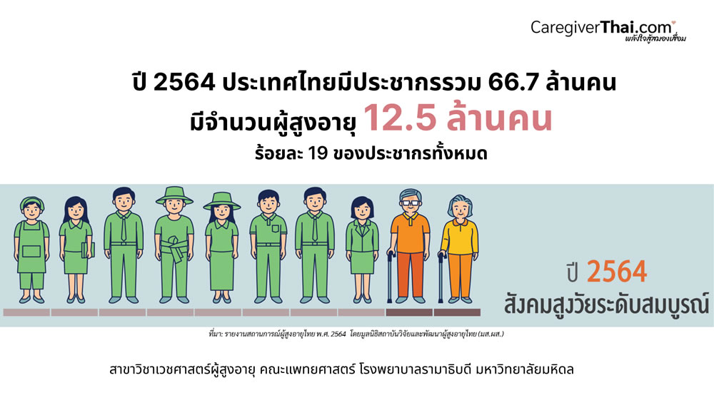 จากรายงานสถานการณ์ผู้สูงอายุไทย พ.ศ. 2564 โดยมูลนิธิสถาบันวิจัยและพัฒนาผู้สูงอายุไทย กล่าวถึงประชากรสูงอายุในประเทศไทย ดังนี้“ในปี 2564 ประเทศไทยมีประชากรรวม 66.7 ล้านคน ประชากรสูงอายุของประเทศไทยได้เพิ่มจำนวนขึ้นอย่างเร็วมาก เมื่อ 50 ปีก่อน ประเทศไทยมีผู้สูงอายุไม่ถึง 2 ล้านคน แต่ในปี 2564 จำนวนผู้สูงอายุเพิ่มเป็น 12.5 ล้านคน หรือคิดเป็นร้อยละ 19 ของประชากรทั้งหมด”