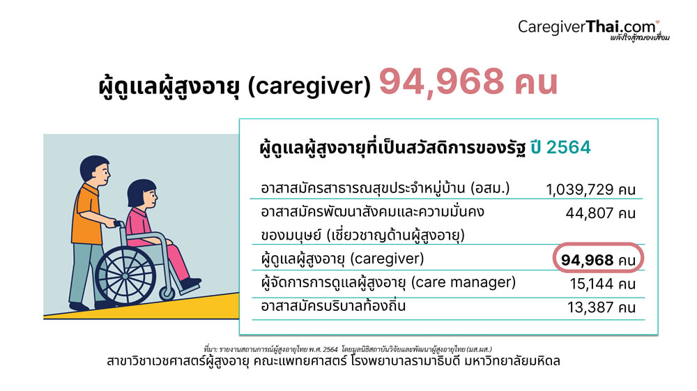 เป็นผู้ชาย 2.0 แสนคน ผู้หญิง 4.8 แสนคน และยังไม่นับรวมกับจำนวนผู้มีภาวะสมองเสื่อมที่อายุไม่ถึงเกณฑ์เป็นผู้สูงอายุ เมื่อเทียบกับตัวเลขจากกรมอนามัย กระทรวงสาธารณสุข ผู้ดูแลผู้สูงอายุที่เป็นสวัสดิการของรัฐประเภทผู้ดูแลผู้สูงอายุ (caregiver) ในปี 2564 มีเพียง 94,968 คน ในปัจจุบันการดูแลผู้มีภาวะสมองเสื่อมส่วนใหญ่เป็นการดูแลโดยคนในครอบครัว การเสริมพลังให้ผู้ดูแลกลุ่มนี้จึงเป็นจุดเปลี่ยนที่สำคัญของการดูแลผู้มีภาวะสมองเสื่อมในสังคมไทยอย่างมีประสิทธิผล